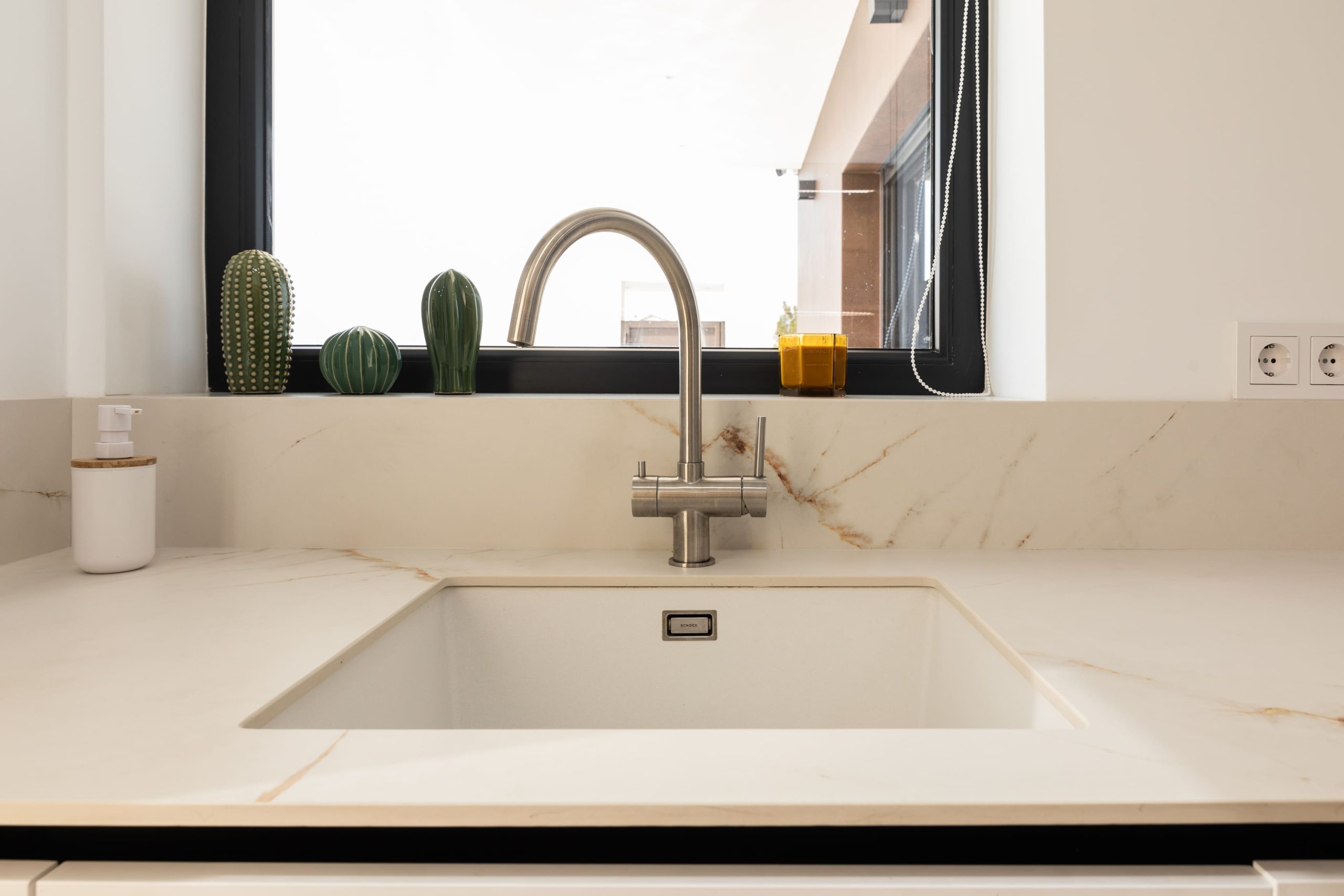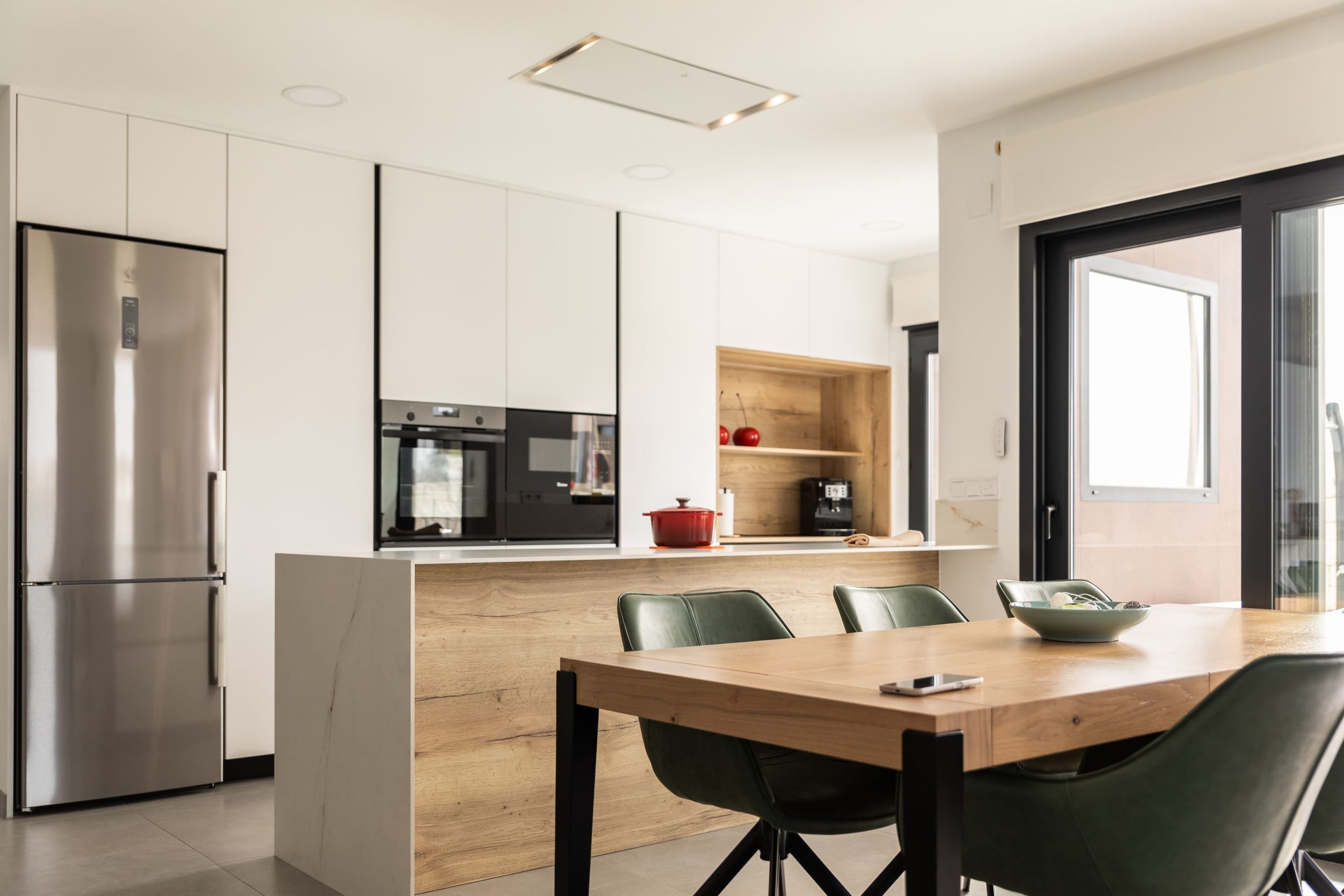 La cocina en blanco mate anti huellas, gola en color negro para dar algo de carácter al conjunto, el desayunador en laminado madera con led y la bancada creada a partir del modelo Syrac Silk de ARKLAM. Y como colofón final cuenta con inducción invisible, lo que permite cocinar directamente sobre la enciemera. Todo lo mencionado hace que el conjunto sea una comunión total entre diseño, calidad, limpieza y elegancia.
