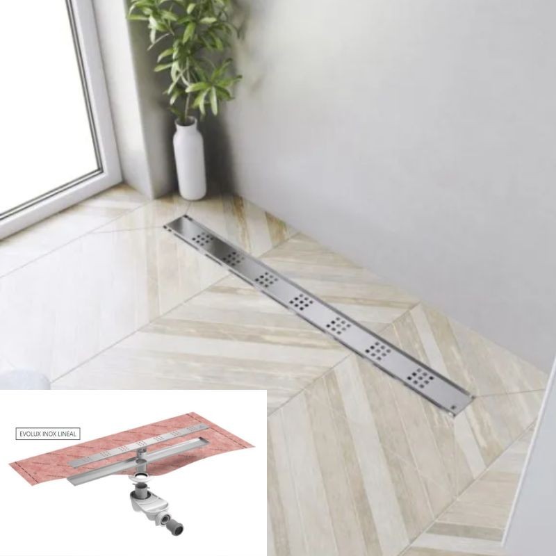El sistema Evolux lineal inoxidable es la solución ideal para realizar el de drenaje con protección impermeable para platos de ducha de obra.