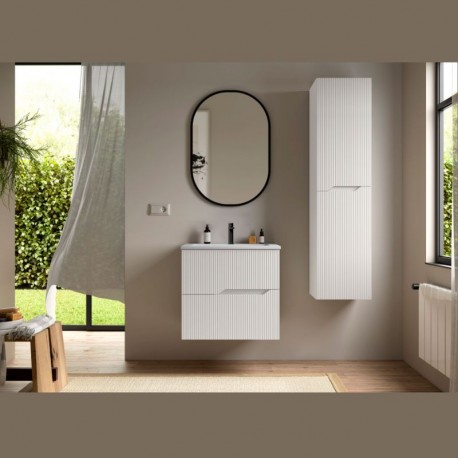 Diseñado para ser suspendido a pared, este mueble ofrece una apariencia moderna y despejada, ideal para baños de estilo minimalista o contemporáneo. Su estilo ranurado añade un detalle decorativo único que se complementa con los 4 colores disponibles: Blanco mate, roble natural, leaft mate y moka mate, permitiendo que personalices el mueble según la decoración de tu baño.