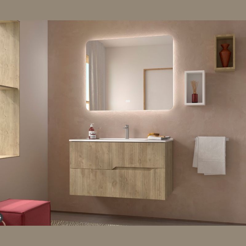 Diseñado para ser suspendido a pared, este mueble ofrece una apariencia moderna y despejada, ideal para baños de estilo minimalista o contemporáneo. Su estilo ranurado añade un detalle decorativo único que se complementa con los 4 colores disponibles: Blanco mate, roble natural, leaft mate y moka mate, permitiendo que personalices el mueble según la decoración de tu baño.