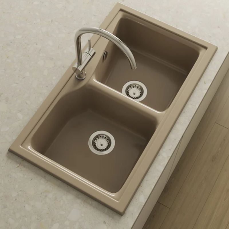City 322/ 332 es un fregadero sobre encimera de dos senos asimétricos de similar tamaño, pero con formas ligeramente distintas entre sí, con una separación de 53 mm entre ambos.