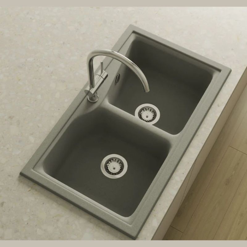 City 322/ 332 es un fregadero sobre encimera de dos senos asimétricos de similar tamaño, pero con formas ligeramente distintas entre sí, con una separación de 53 mm entre ambos.