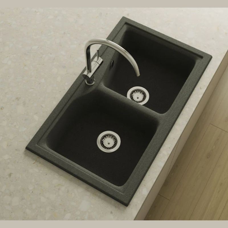 City 322/ 332 es un fregadero sobre encimera de dos senos asimétricos de similar tamaño, pero con formas ligeramente distintas entre sí, con una separación de 53 mm entre ambos.
