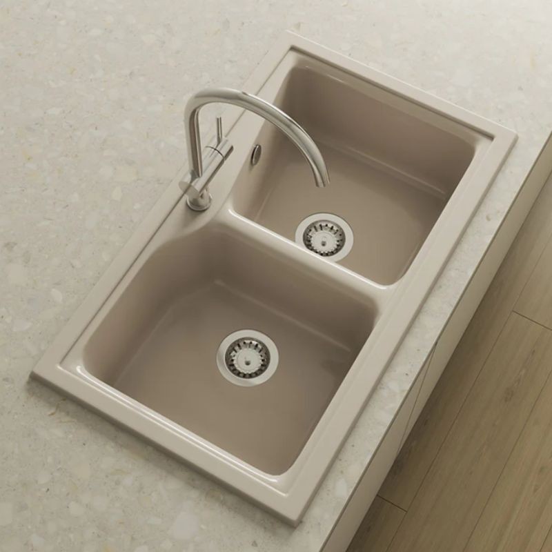 City 322/ 332 es un fregadero sobre encimera de dos senos asimétricos de similar tamaño, pero con formas ligeramente distintas entre sí, con una separación de 53 mm entre ambos.