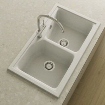 City 322/ 332 es un fregadero sobre encimera de dos senos asimétricos de similar tamaño, pero con formas ligeramente distintas entre sí, con una separación de 53 mm entre ambos.