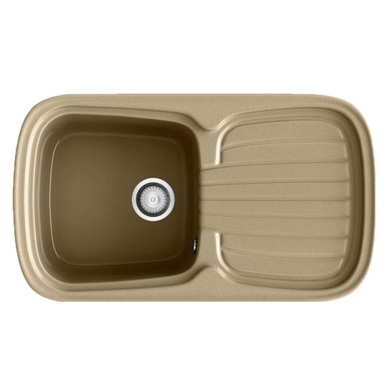 Diamante 106 es un fregadero de fibra de vidrio pensado para colocarse sobre la encimera, con un diseño de planta rectangular y esquinas redondeadas.
