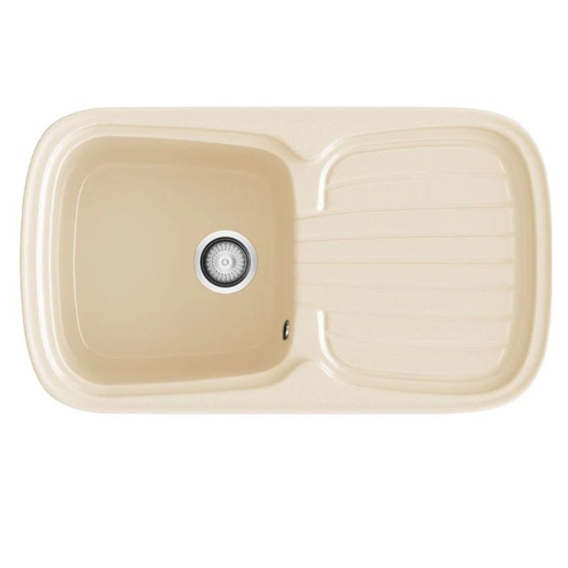 Diamante 106 es un fregadero de fibra de vidrio pensado para colocarse sobre la encimera, con un diseño de planta rectangular y esquinas redondeadas.