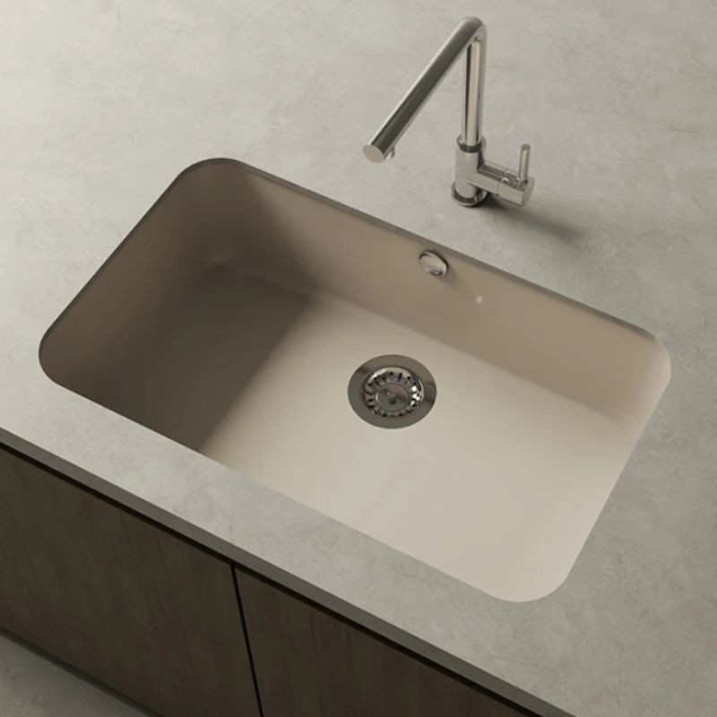 Puede colocarse tanto sobre encimera como bajo encimera. Un fregadero de líneas curvas sencillo y funcional.