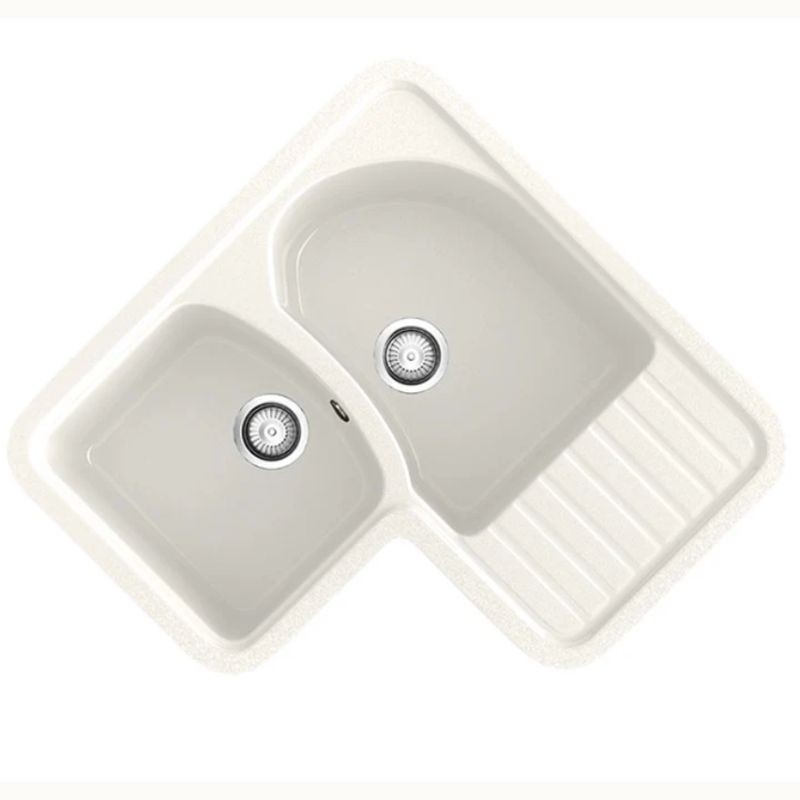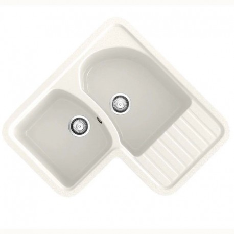 Este fregadero Jade 118 está pensado para aprovechar todo el espacio de la cocina gracias a su colocación en esquina, quedando el seno de mayor tamaño en el rincón y el escurridor a la derecha de éste.