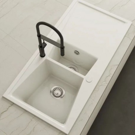 Kuma 305 es un fregadero sobre encimera de gran tamaño y planta rectangular. Presenta dos senos ligeramente diferentes en forma y profundidad trapezoide y un escurridor de superficie rugosa. Un diseño rompedor de líneas diagonales ideal para espacios de estética industrial.