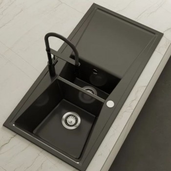 Kuma 305 es un fregadero sobre encimera de gran tamaño y planta rectangular. Presenta dos senos ligeramente diferentes en forma y profundidad trapezoide y un escurridor de superficie rugosa. Un diseño rompedor de líneas diagonales ideal para espacios de estética industrial.
