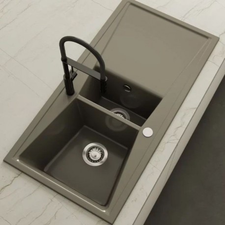 Kuma 305 es un fregadero sobre encimera de gran tamaño y planta rectangular. Presenta dos senos ligeramente diferentes en forma y profundidad trapezoide y un escurridor de superficie rugosa. Un diseño rompedor de líneas diagonales ideal para espacios de estética industrial.