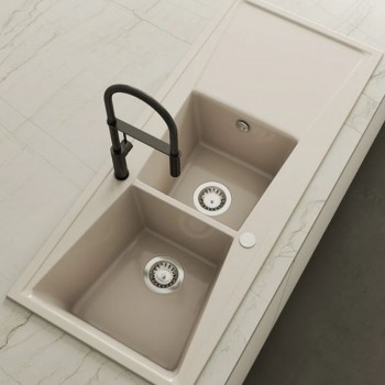 Kuma 306 es un fregadero sobre encimera de gran tamaño y planta rectangular. Presenta dos senos ligeramente diferentes en forma trapezoide y un escurridor de superficie rugosa. Un diseño rompedor de líneas diagonales ideal para espacios de estética industrial.