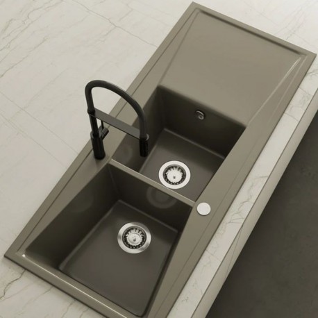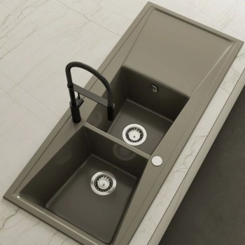 Kuma 306 es un fregadero sobre encimera de gran tamaño y planta rectangular. Presenta dos senos ligeramente diferentes en forma trapezoide y un escurridor de superficie rugosa. Un diseño rompedor de líneas diagonales ideal para espacios de estética industrial.