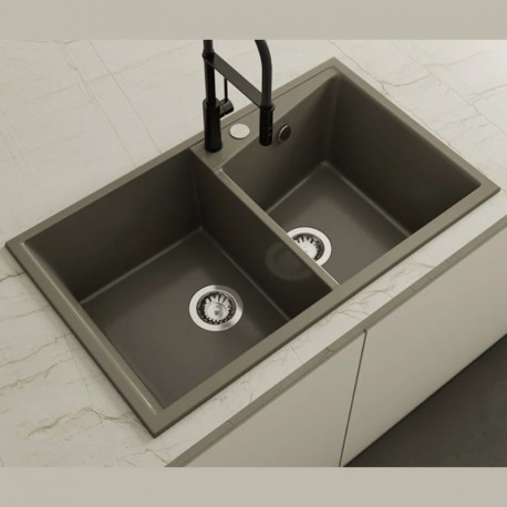 Kuma 304 es un fregadero sobre encimera de gran tamaño de planta rectangular con dos senos ligeramente diferentes entre sí y que miden 39 cm de ancho cada uno, un diseño rompedor de líneas diagonales ideal para espacios de estética industrial.