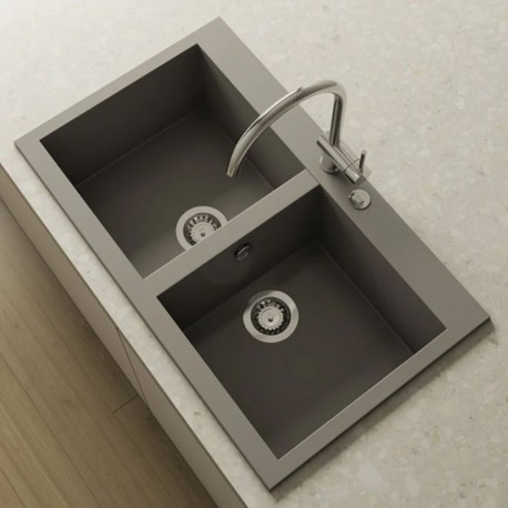 SHIRA 504 es un fregadero sintético de dos senos de planta cuadrada, de 37 x 39 cm cada uno con una separación de 45 mm, para quienes desean disfrutar de la comodidad de la doble cubeta.