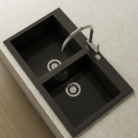 SHIRA 504 es un fregadero sintético de dos senos de planta cuadrada, de 37 x 39 cm cada uno con una separación de 45 mm, para quienes desean disfrutar de la comodidad de la doble cubeta.
