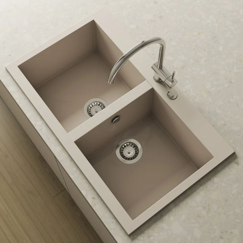 SHIRA 504 es un fregadero sintético de dos senos de planta cuadrada, de 37 x 39 cm cada uno con una separación de 45 mm, para quienes desean disfrutar de la comodidad de la doble cubeta.