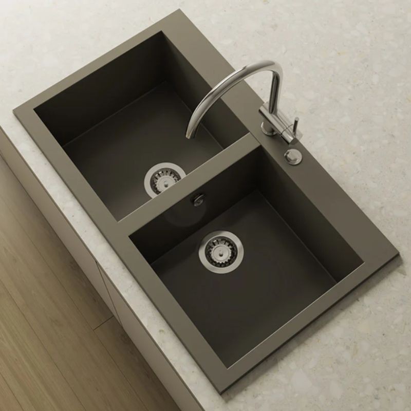 SHIRA 504 es un fregadero sintético de dos senos de planta cuadrada, de 37 x 39 cm cada uno con una separación de 45 mm, para quienes desean disfrutar de la comodidad de la doble cubeta.