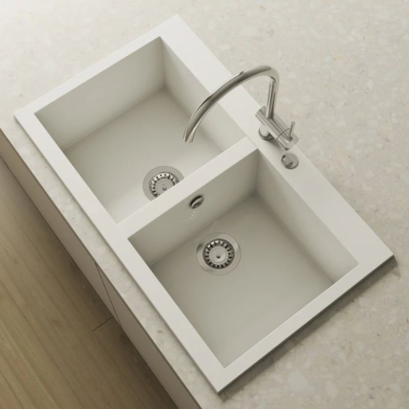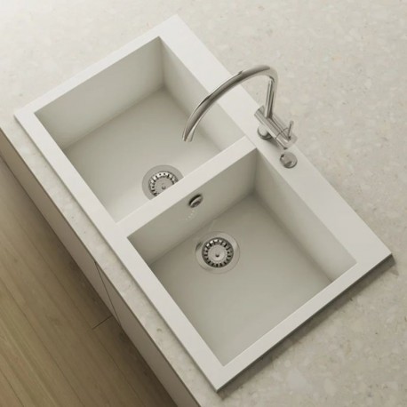 SHIRA 504 es un fregadero sintético de dos senos de planta cuadrada, de 37 x 39 cm cada uno con una separación de 45 mm, para quienes desean disfrutar de la comodidad de la doble cubeta.