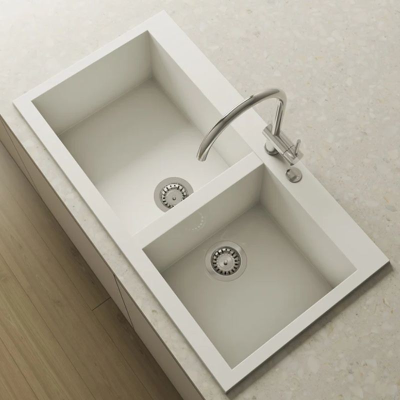 Shira 505 es un fregadero sintético de dos senos, uno de planta rectangular (47 x 39 cm) y otro más pequeño de planta cuadrada (37 x 39 cm), con una separación de 45 mm entre ambos.