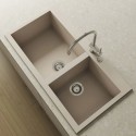 Shira 505 es un fregadero sintético de dos senos, uno de planta rectangular (47 x 39 cm) y otro más pequeño de planta cuadrada (37 x 39 cm), con una separación de 45 mm entre ambos.