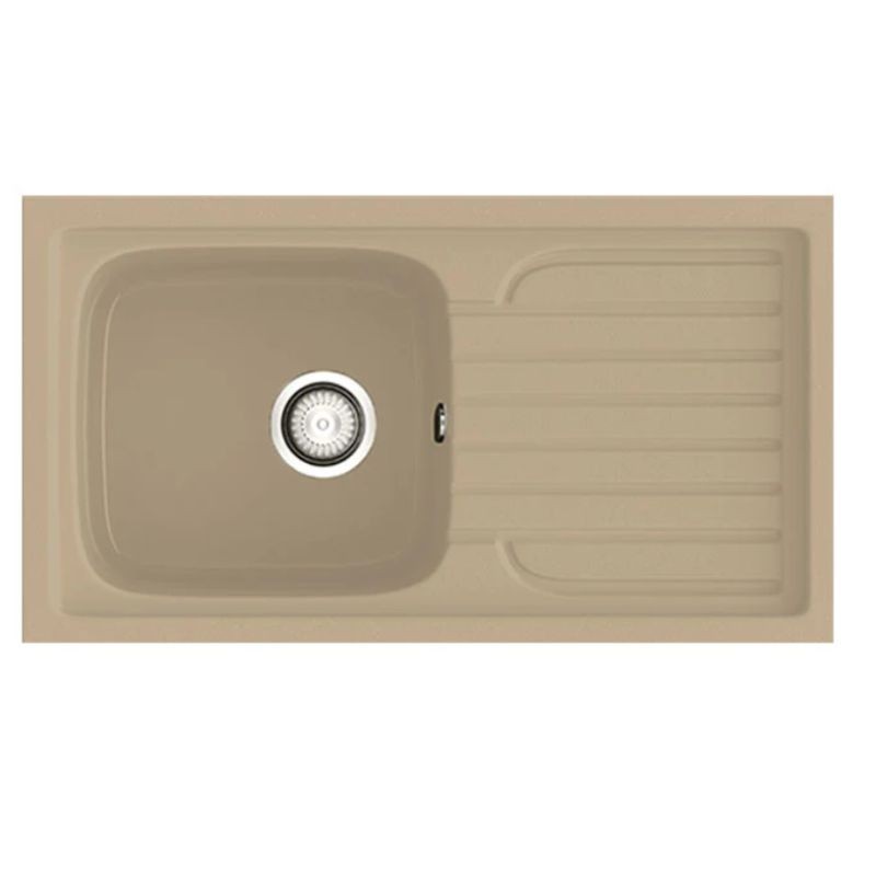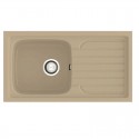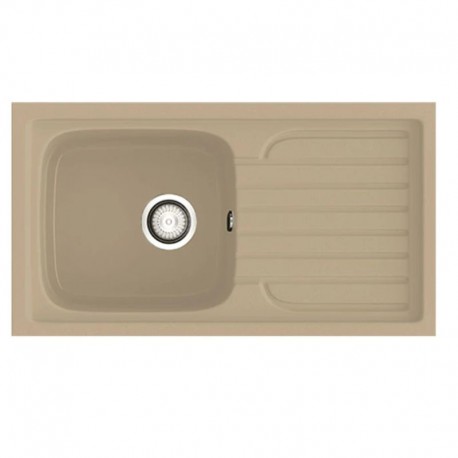 Topacio 116 es un fregadero de fibra de vidrio sobre encimera. Su diseño de planta rectangular y líneas rectas contrasta con las esquinas redondeadas del fregadero.