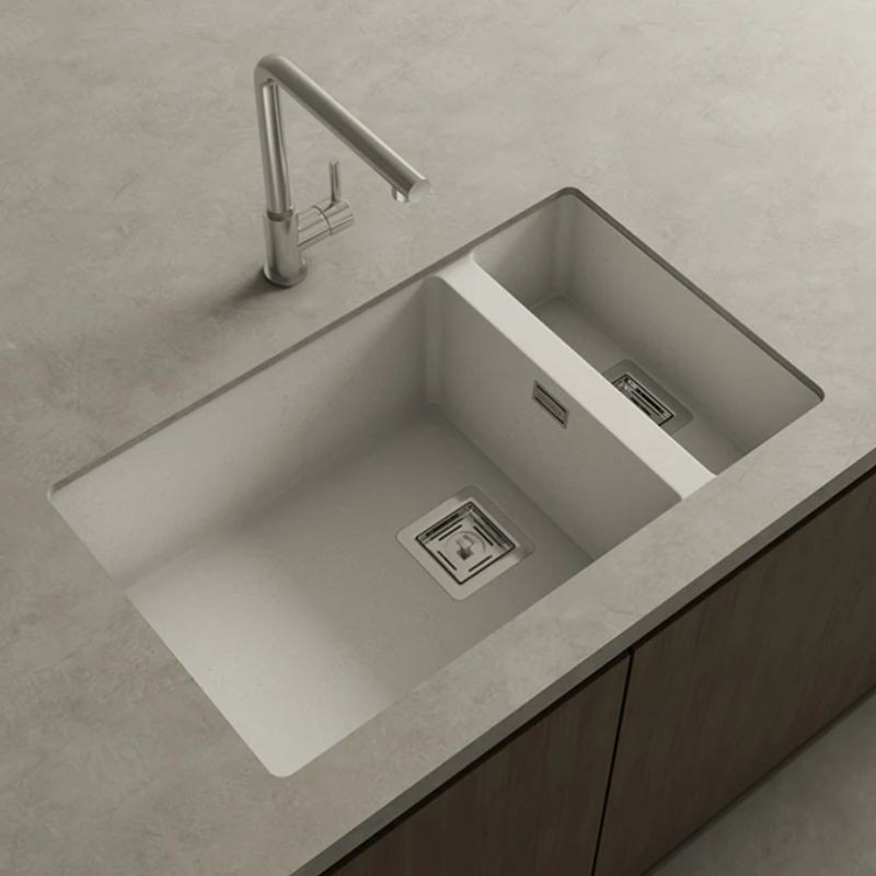 Estudiado para un mueble de 80 cm como mínimo, su diseño y la posición de las válvulas están pensados para que la colocación del seno pequeño pueda ser en la parte izquierda o en la derecha indistintamente.