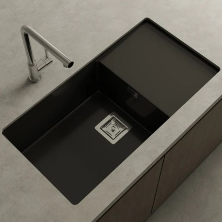De líneas minimalistas, este fregadero está pensado para un mueble de 90 cm. Su diseño y la posición de las válvulas están pensados para que la colocación del escurridor pueda ser en la parte izquierda o en la derecha indistintamente.