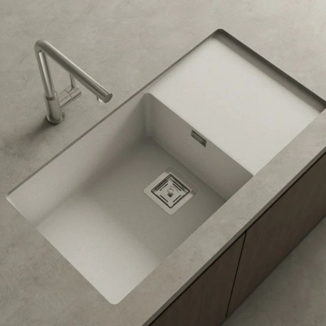De líneas minimalistas, este fregadero está pensado para un mueble de 90 cm. Su diseño y la posición de las válvulas están pensados para que la colocación del escurridor pueda ser en la parte izquierda o en la derecha indistintamente.