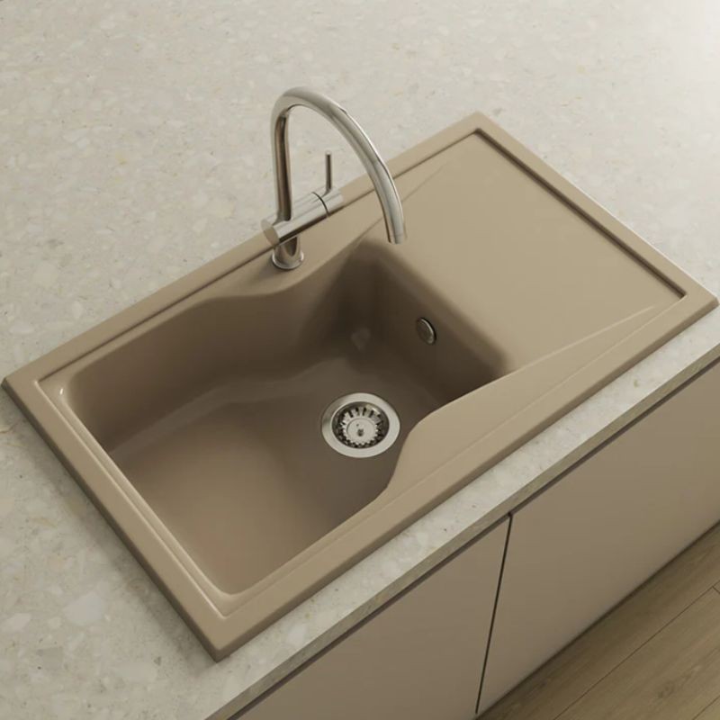 City 331 es un fregadero sobre encimera de un seno con una forma muy original que incluye un escurridor de 25 cm de ancho.